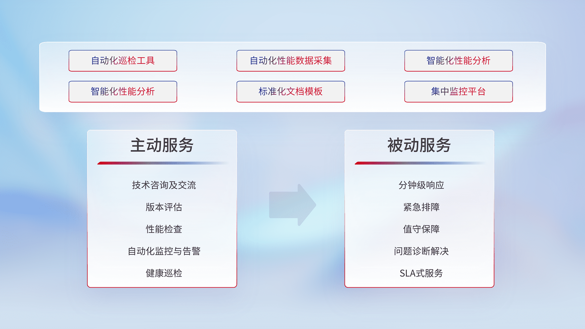 智能化工具和标准化文档,,,,保障服务质量,,,提供主动服务(包含技术咨询、、版本评估、、性能检查、、、自动化监控与告警、、、健康巡检)和被动服务包含(分钟级响应、、、、紧急排障、、、、值守保障、、、、问题诊断解决、、SLA服务)。。。
