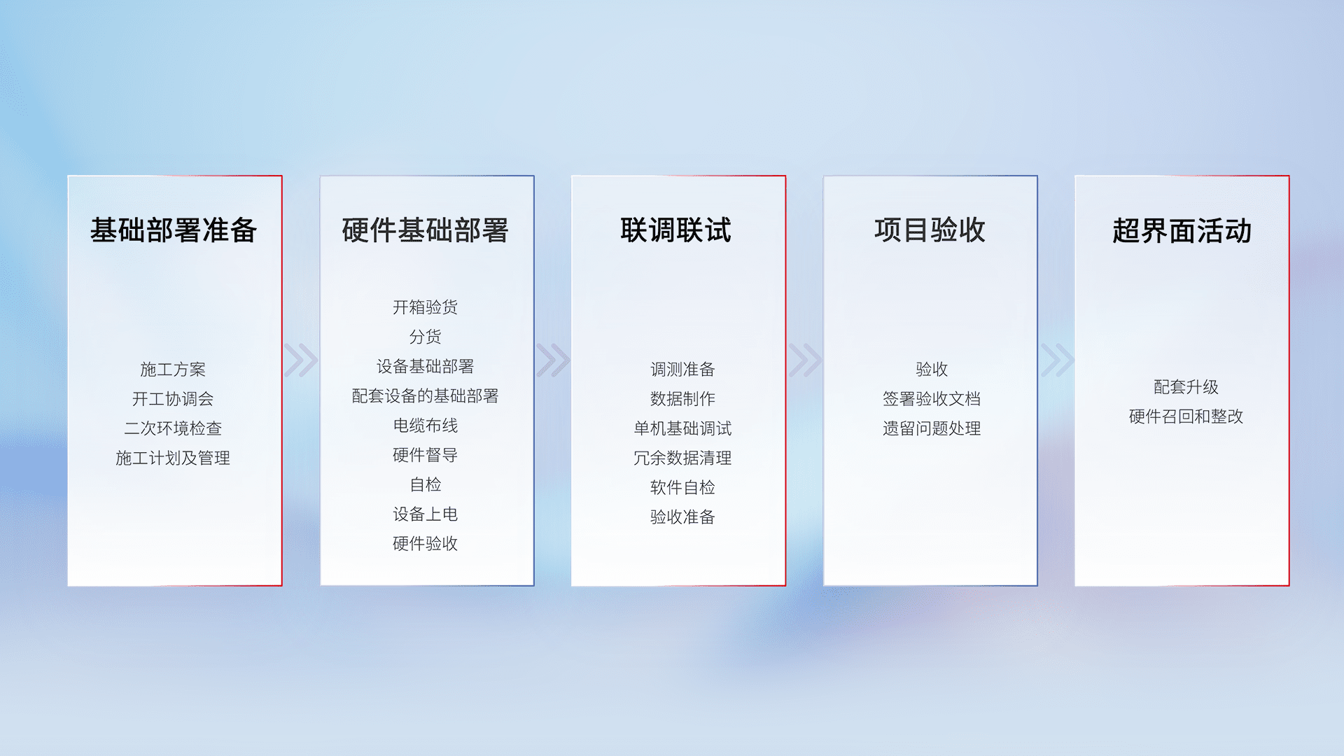 从基础部署准备、、、硬件基础部署、、联调联试、、项目验收、、、、越界面活动的全过程可追溯,,,保证施工质量和进度。。